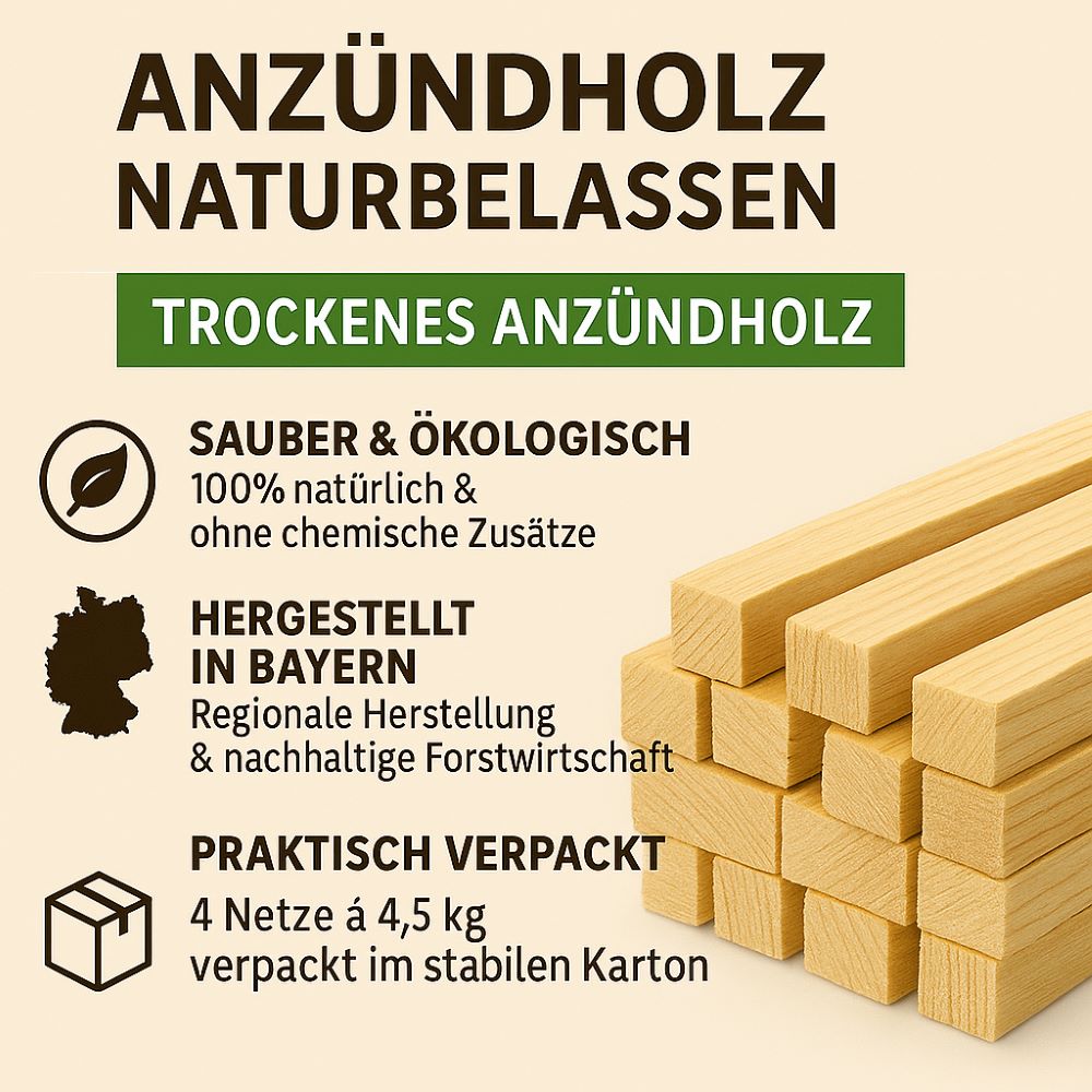 "Premium Anzündholz 18 kg (4×4,5 kg) – Trockenes Fichten-Anmachholz für Kamin, Grill & Feuerstelle | Schnell entzündlich & sauber brennend"